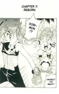Dorimon disappears so Hikaru charges at Duke for killing his partner. We then see Dorimon isn't dead and it is revealved that Duke had to 'kill' Dorimon in order to plant a Dragon Spirit at just the right time. It is also revealed that everything they have done has been training just as Masuken thought. They are about to train more when Duke senses evil, think he evolves to normal Dukemon and then opens a porthole where the kids see a very injured Omegamon. Hikaru says they must go to him and that Kiyoshi (the 4th kid that go sucked in during Chapter 1) is also there. Hikaru charges through but Duke stops the others ordering Mame to follow Hikaru until he can go himself. He tells the kid he'll transmit a super evolution sphere to them. Duke then gives them power and says the merging process will be painful. Omegamon tells Hikaru that MetalPhantomon created an unstopable devil (Death-X Mon). Hikaru tells him that Dori has a new spirit thanks to Duke and that he will stop Death-X. MetalPhantomon stats that Dori should now be dead but Hikaru produces a sphere and Dori evolves again to Grade. MetalPhanto sends Ultimate Brachimon against him and UB gets trashed. MetalPhantomon is very suprised that Grade killed a perfect in 1 go. Death-X is sent into battle Grade. Death-X attacks but Hikaru continously lets out energy spheres to help Grade defend himself. Teru says he can't do it (meaning merge evolve) however we see Masuken floating and in a reasonable amount of pain (he was told). Grade is hurt but Mame forces through an attack. We then see Ouryuumon and Masuken standing in front of him saying he has come to help. |