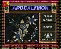 I am Apocalymon, a mutant digimon. My Darkness Zone attack transforms my enemy into nothingness. I have the power to turn everything I touch into total darkness. - Apocalymon.