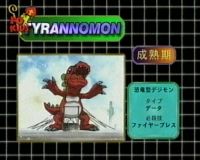 Tyranomon a huge digimon with fire breath strong enough to cook a couple o' boys like you - Piximon