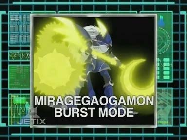 (MirageGaogamon Burst Mode) You did it sir you were able to help me achieve another level of power. In this mode my Meteor Shackle and Final Mirage Burst attacks will propel us to victory ~ MirageGaomon Burst Mode