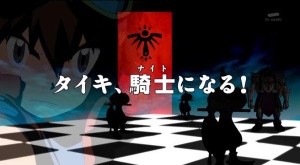 Knightmon is now getting frozen so Taiki Digixroses Shoutmon and Dorulumon to create the Cannon. Bastemon is watching in awe as the cannon is fired slamming into IceDevimon, freezing Knightmon. The PawnChessmon and Knightmon attack him with Checkmate Break making the devil go back to normal size and the rest of the Bagura Army retreating. Taiki sees Kiriha and MailBirdramon leave. Kirhia tells MailBirdramon that Taiki got one up on him and saw through the diversion. Kirhia says he'll let Taiki have this one and that he doesn't do well with the princess.