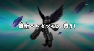 Just when HiMugendramon powers up to fire again, his cannons are stopped by Ba'almon's gun... Ba'almon begins to glow with the light of the warrior. He is reborn into the true warrior, Beelzebumon! He takes aim. "Death The Cannon!" immobilizes the attacking digimon, and Shoutmon X4K finishes the job. HiMugendramon is destroyed! However, Beelzebumon has disappeared.