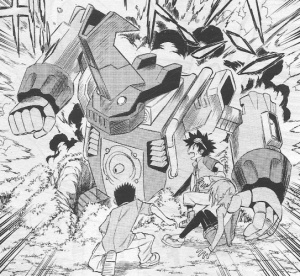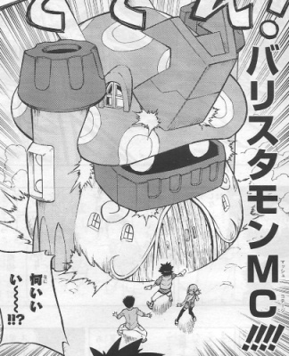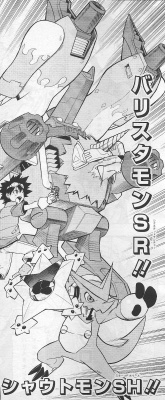 Ballistamon has more role in the manga than the anime. He even got two additional Digixrosses. Ballistamon Mush Cottage and Ballistamon SR. Ballistamon arrives part way through Chapter 1 and is friends with Shoutmon. He helps to protect Taiki's friends.
